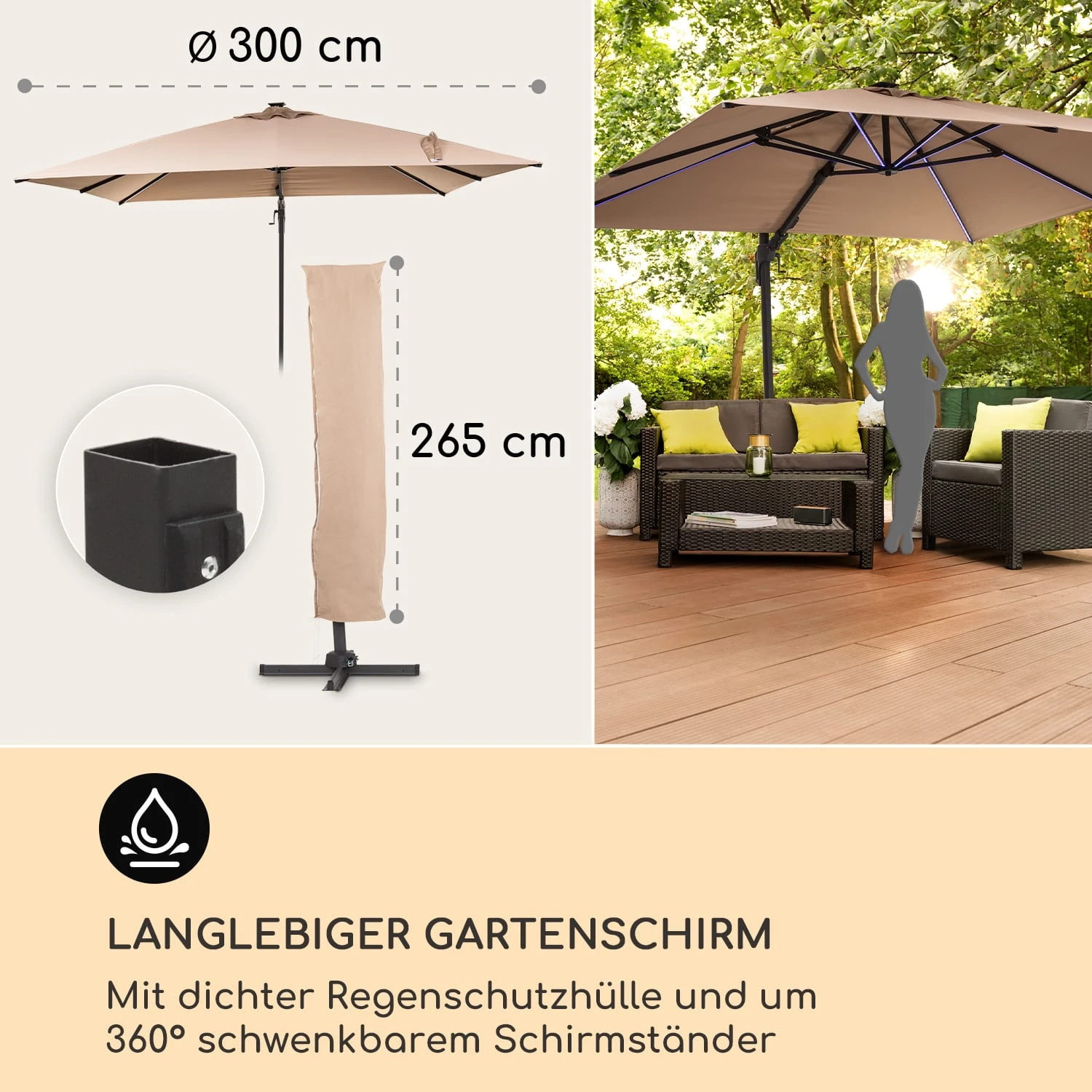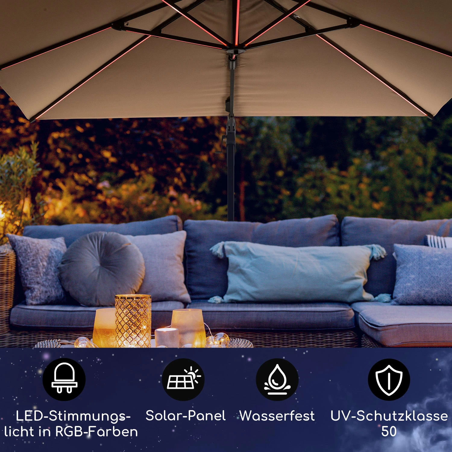Dabei ist der blumfeldt Arles Sonnenschirm auch des Nachts eine stimmungsvolle Bereicherung für Garten und Terrasse. Seine integrierte LED-Beleuchtung verleiht der Sitzecke ein stimmungsvolles Ambiente in sieben wählbaren Farben.