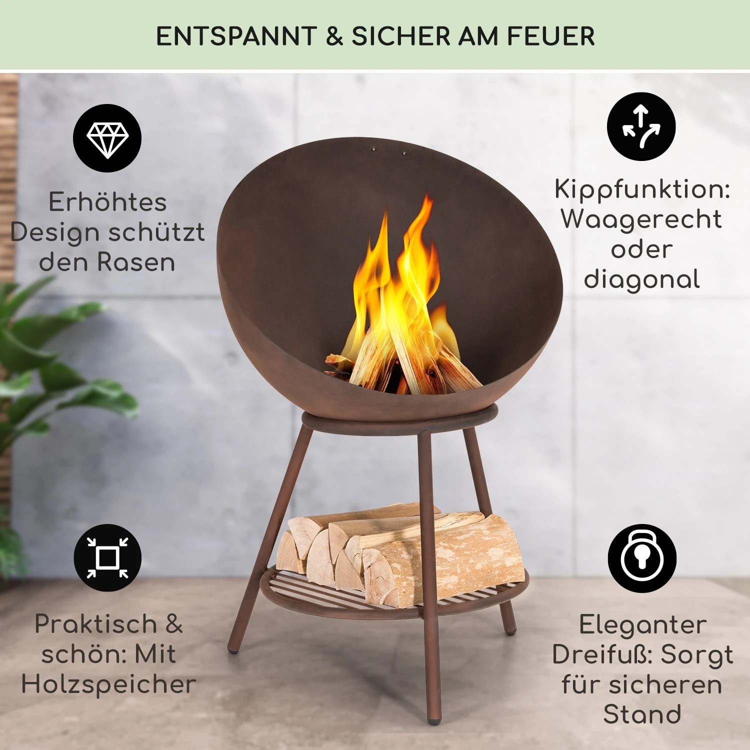 Erlebe wandlungsfähige Lagerfeuerstimmung mit Blick auf die wärmenden Flammen: Hier kannt du bei horizontaler Ausrichtung komfortabel Grillen oder die Halbkugel diagonal ausrichten für ein windgeschütztes Feuerspiel. Mit seiner 2 mm starken Stahlwand ist die Azuma Feuerschale von blumfeldt sehr robust und steht sicher auf dem hohen Dreifuß. Für Komfort beim Grillen, beim Schüren und Genießen sorgt zudem die untere Ablage, auf welcher du dekorativ die benötigten Holzscheite lagern kannst. Für langlebige Freude schütz eine Regenhaube deine neue Grillstelle vor Wind und Wetter. Dank dem mitgeliefertem Schürhaken und der Aschepfanne ist es ein Leichtes, das Feuer für erholsame Abendstunden zu schüren.