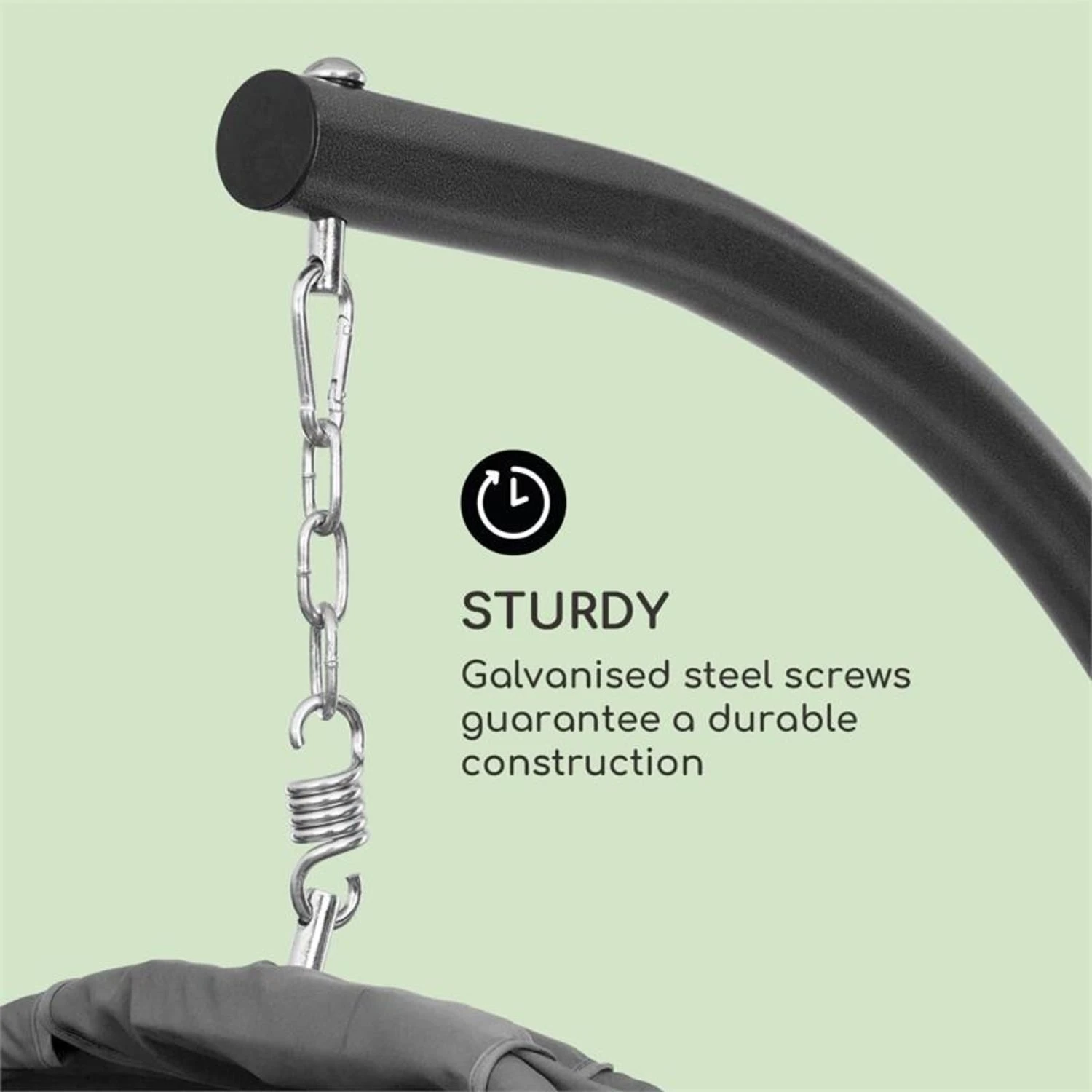 Der freistehende Bella Donna Hängesessel ist dank eines Sitzkissens mit einer weichen, 12 cm hohen Füllung besonders bequem. Die Unique Comfort-Erfahrung wird durch eine flauschige Seitenpolsterung zusätzlich erhöht. Durch einen robusten Standfuß aus Stahl ist die Stabilität der des tragfähigen Rahmens jederzeit gewährleistet. Verzinkte Stahlschrauben sorgen zudem für die notwendige Langlebigkeit der gesamten Konstruktion. An einer starken Metallkette ist der Sitzkorb befestigt, der die Bella Donna durch einen resistenten Bezug aus 180g Polyester in einen schützenden Kokon verwandelt und somit ein entspanntes Schwing- und Schwebevergnügen ermöglicht. Als Montagesatz geliefert kann die Bella Donna im im Nu aufgebaut und für den bequemen Transport mit wenigen Handgriffen wieder abgebaut werden.