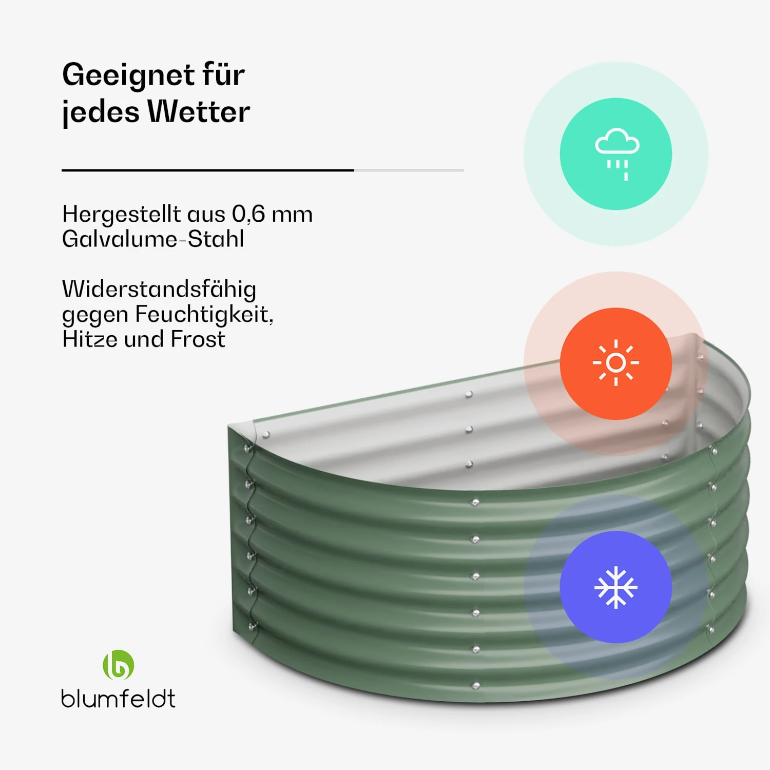 Denn saftige Tomaten, süße Erdbeeren, knackige Zucchini und aromatische Kräuter lassen sich dank optimaler Wachstumsbedingungen spielend leicht heranziehen. Einjährige Pflanzen und alljährliche Gärtnerfreuden: Die stabile Rahmenkonstruktion des Gartenbeetes von blumfeldt ist aus Stahl-Wellblech und durch eine spezielle Zink-Legierung rost- und frostsicher. So trotzt das High Grow ganzjährig Wind und Wetter. Die halbrunde Form macht das Hochbeet aus Metall von blumfeldt zudem ganzjährig zu einem optischen Hingucker und verleiht zusätzliche Stabilität.