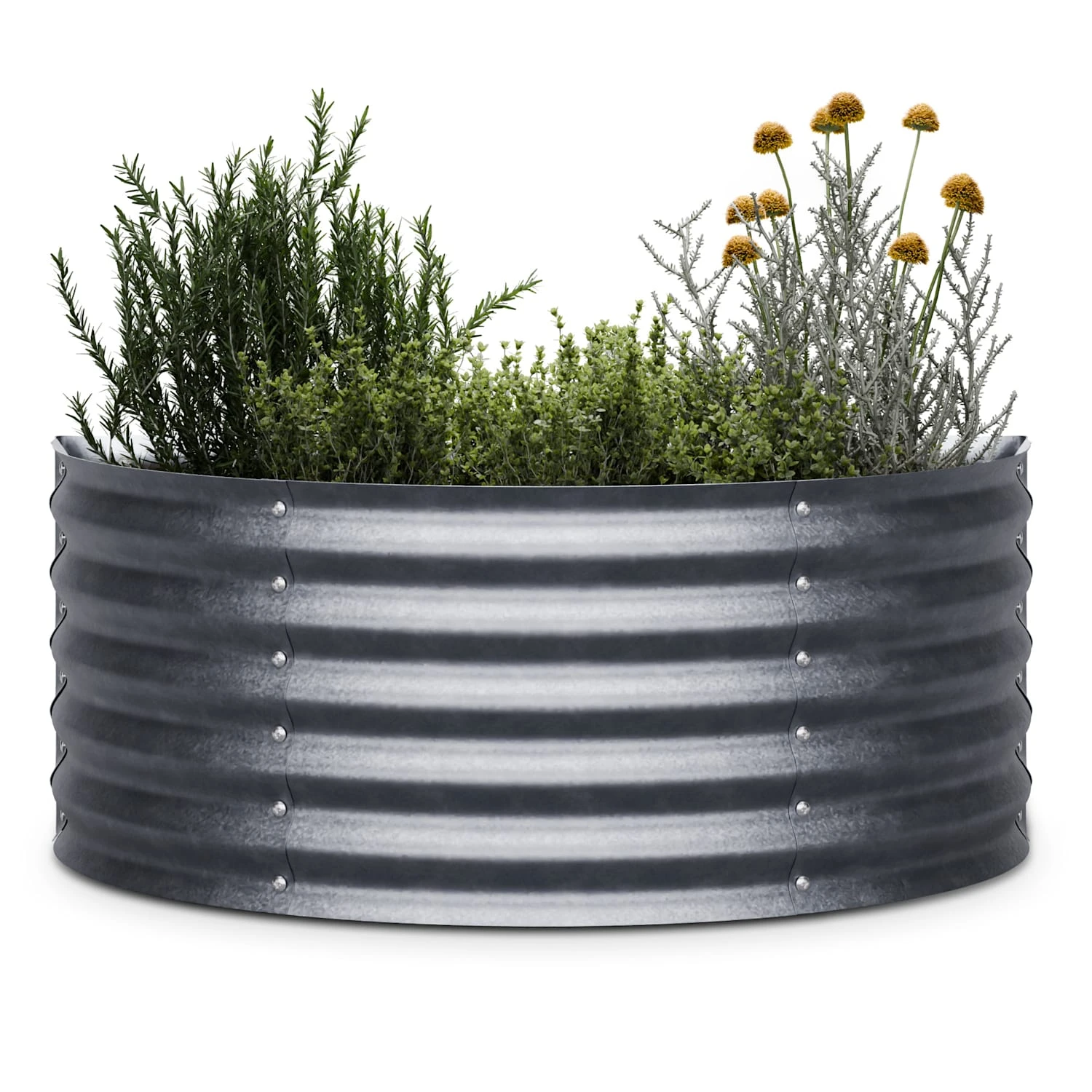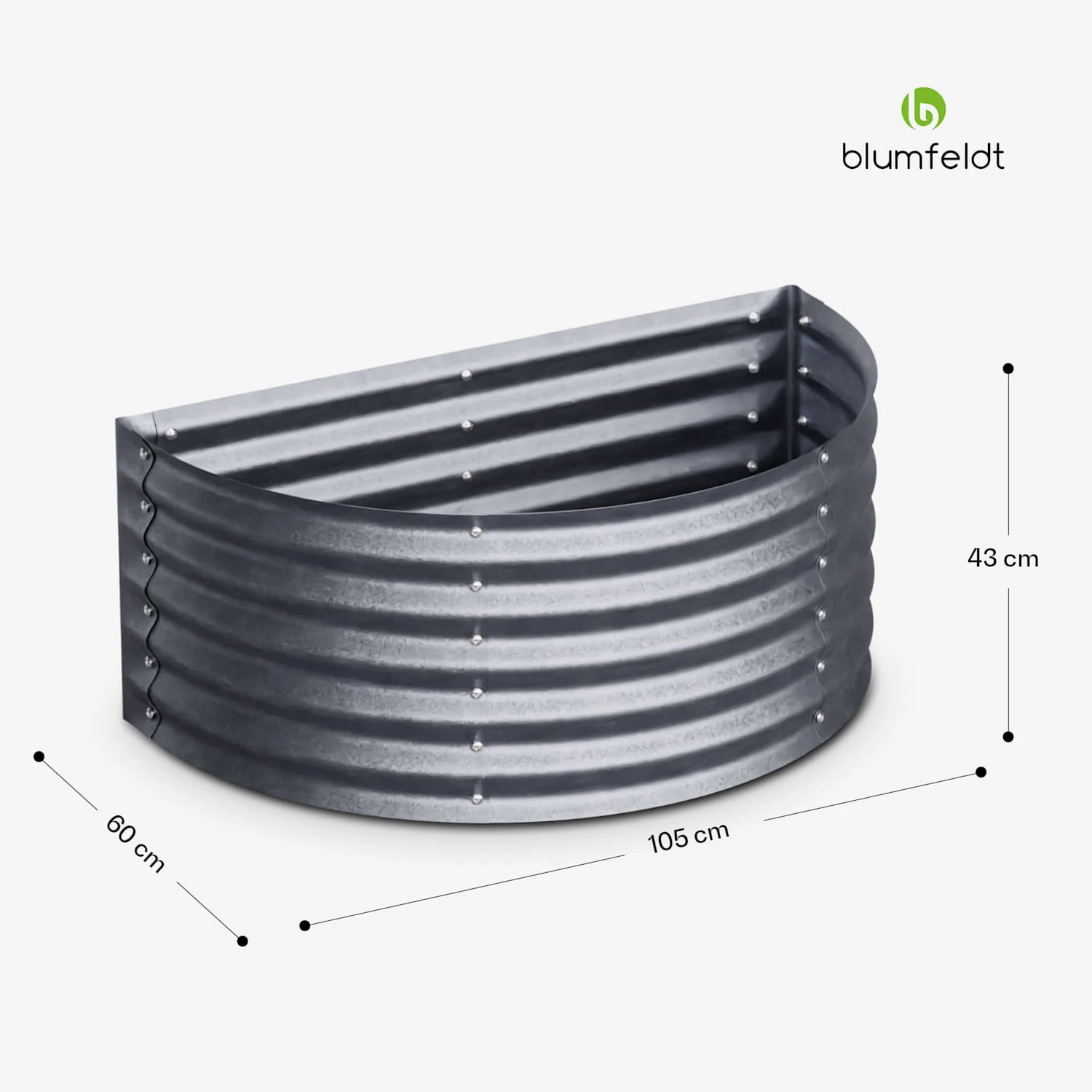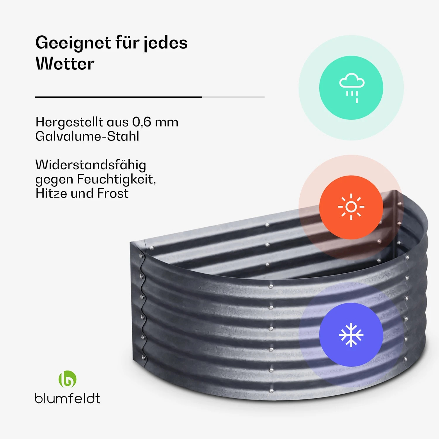 Denn saftige Tomaten, süße Erdbeeren, knackige Zucchini und aromatische Kräuter lassen sich dank optimaler Wachstumsbedingungen spielend leicht heranziehen. Einjährige Pflanzen und alljährliche Gärtnerfreuden: Die stabile Rahmenkonstruktion des Gartenbeetes von blumfeldt ist aus Stahl-Wellblech und durch eine spezielle Zink-Legierung rost- und frostsicher. So trotzt das High Grow ganzjährig Wind und Wetter. Die halbrunde Form macht das Hochbeet von blumfeldt zudem ganzjährig zu einem optischen Hingucker und verleiht zusätzliche Stabilität.