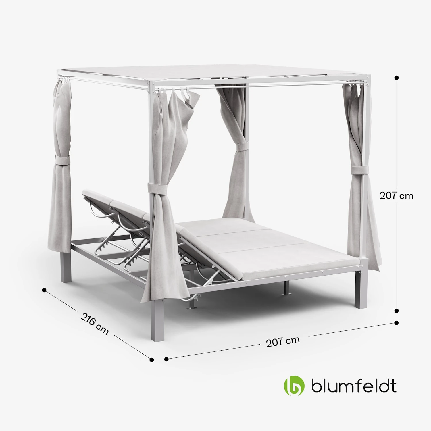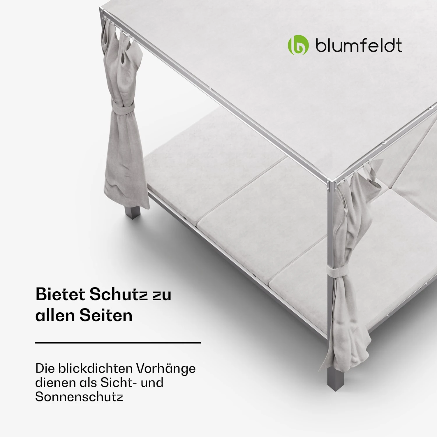 Die Vorhänge an allen 4 Seiten bieten nicht nur Privatsphäre, sondern schützen auch vor Sonne, Wind und unerwünschten Blicken, während sie gleichzeitig ein gemütliches und intimes Ambiente schaffen. Die hochwertigen, wetterfesten Materialien und der pulverbeschichtete Aluminiumrahmen sorgen für eine lange Lebensdauer und machen das blumfeldt Eremitage Triple Sunbed zu einem langlebigen Begleiter für Ihre Outdoor-Entspannung.