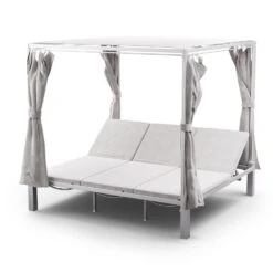 Mit vier verschiedenen Positionen für die Rückenlehne können Sie ganz einfach die optimale Neigung finden, um sich zu entspannen und die Sonne zu genießen. Die Blickdichtigkeit und der Sonnenschutz der Vorhänge sowie die wasserfesten Eigenschaften des Materials gewährleisten zusätzlichen Komfort und Schutz.