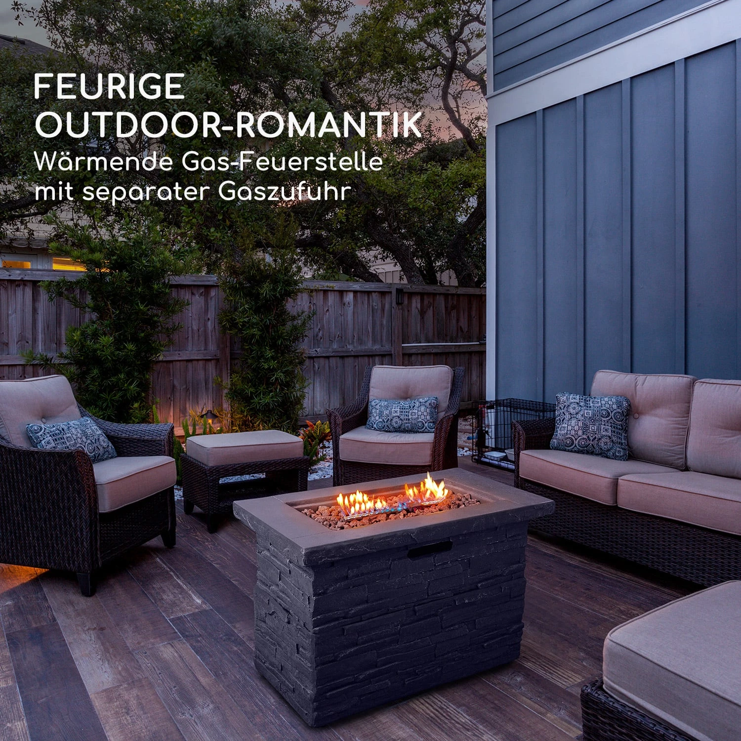 Feurige Outdoor-Romantik: wärmende Gas-Feuerstelle mit separater Gaszufuhr