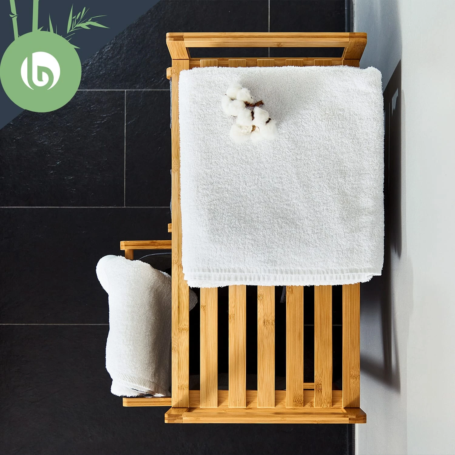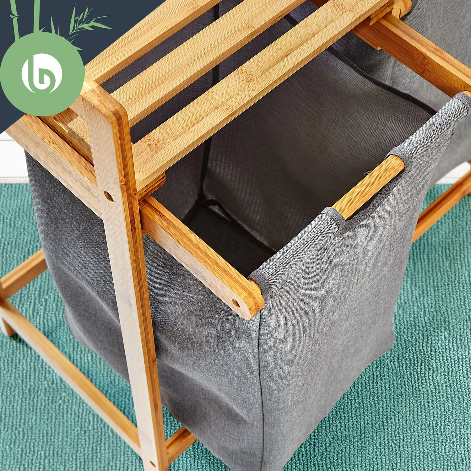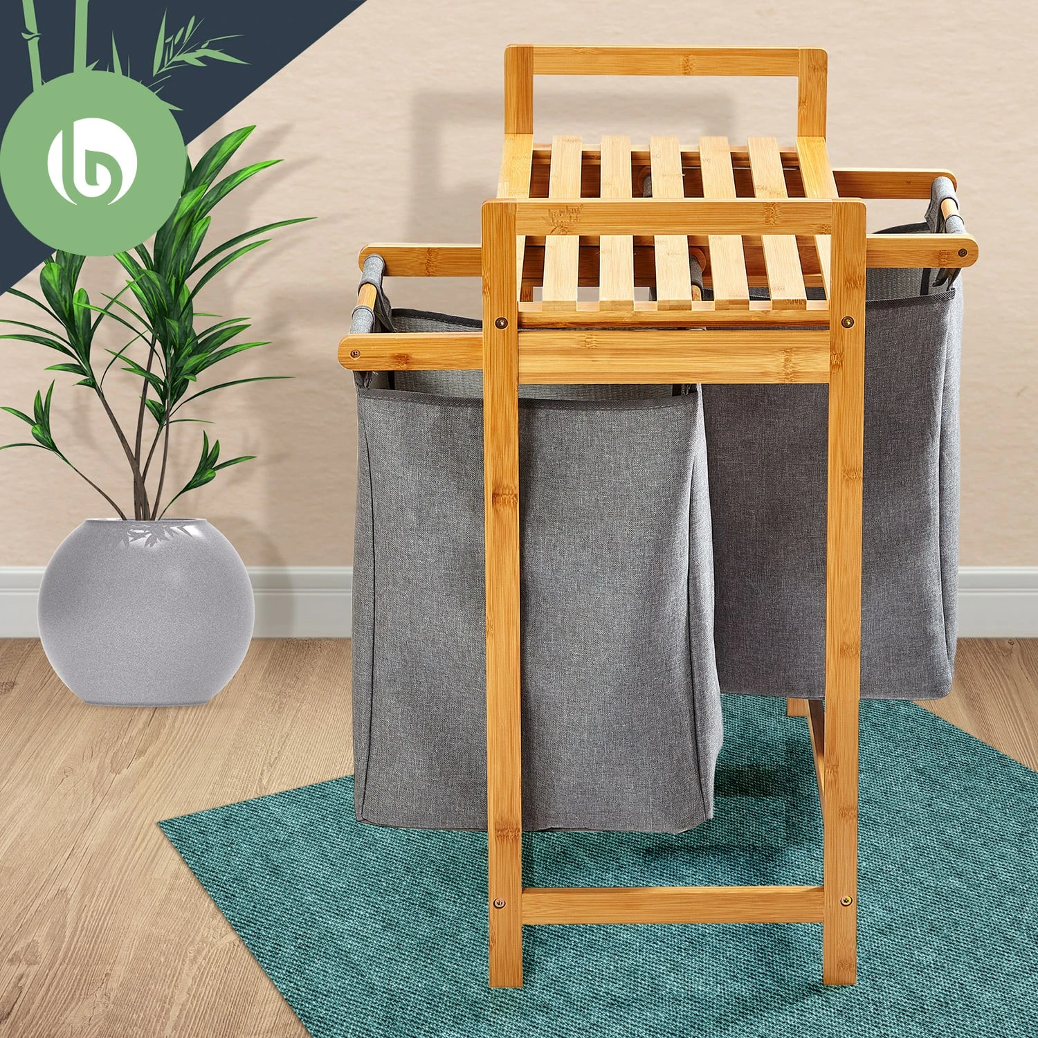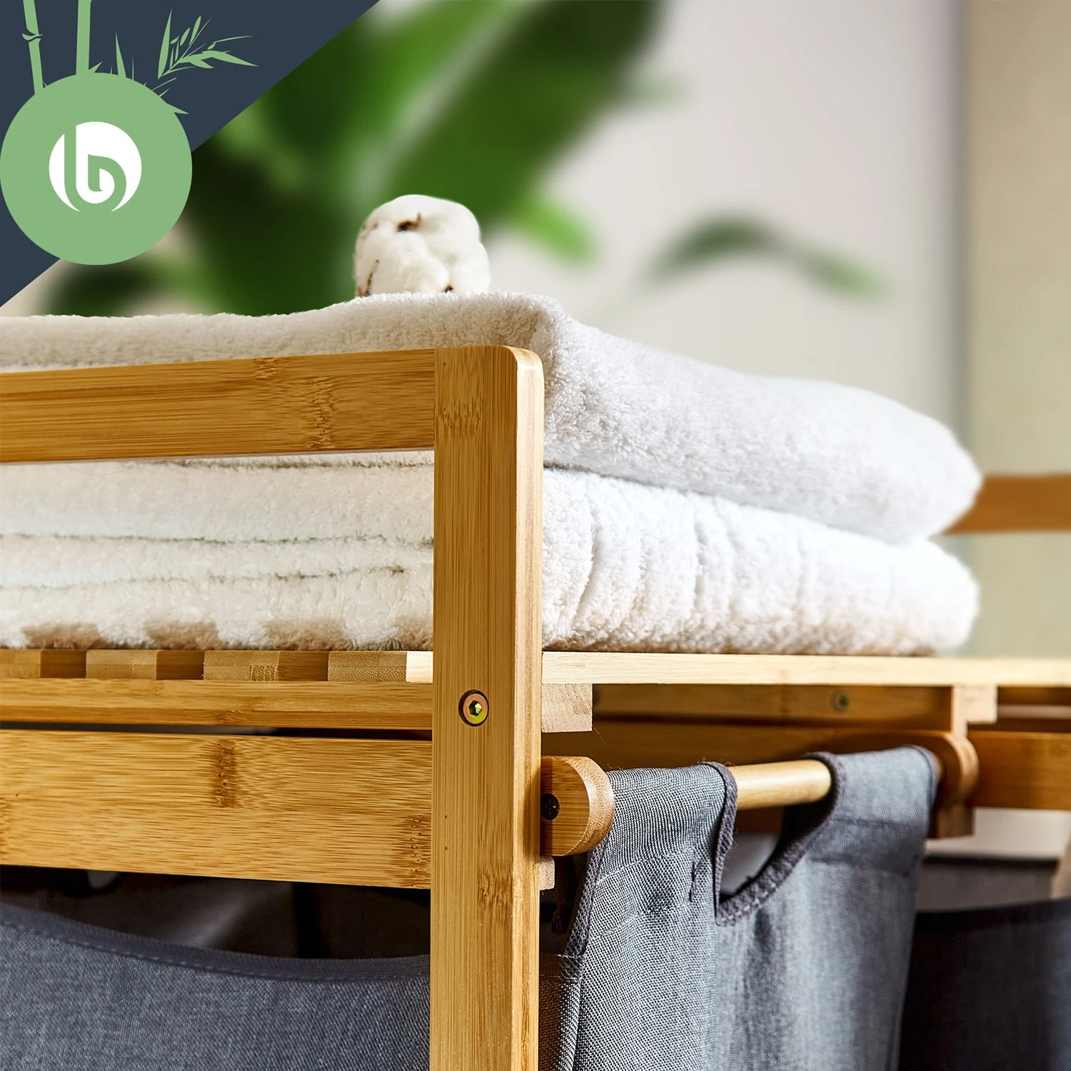 Natürliche Materialien: Wäschestation aus Bambus mit Waschsäcken aus Baumwollleinen