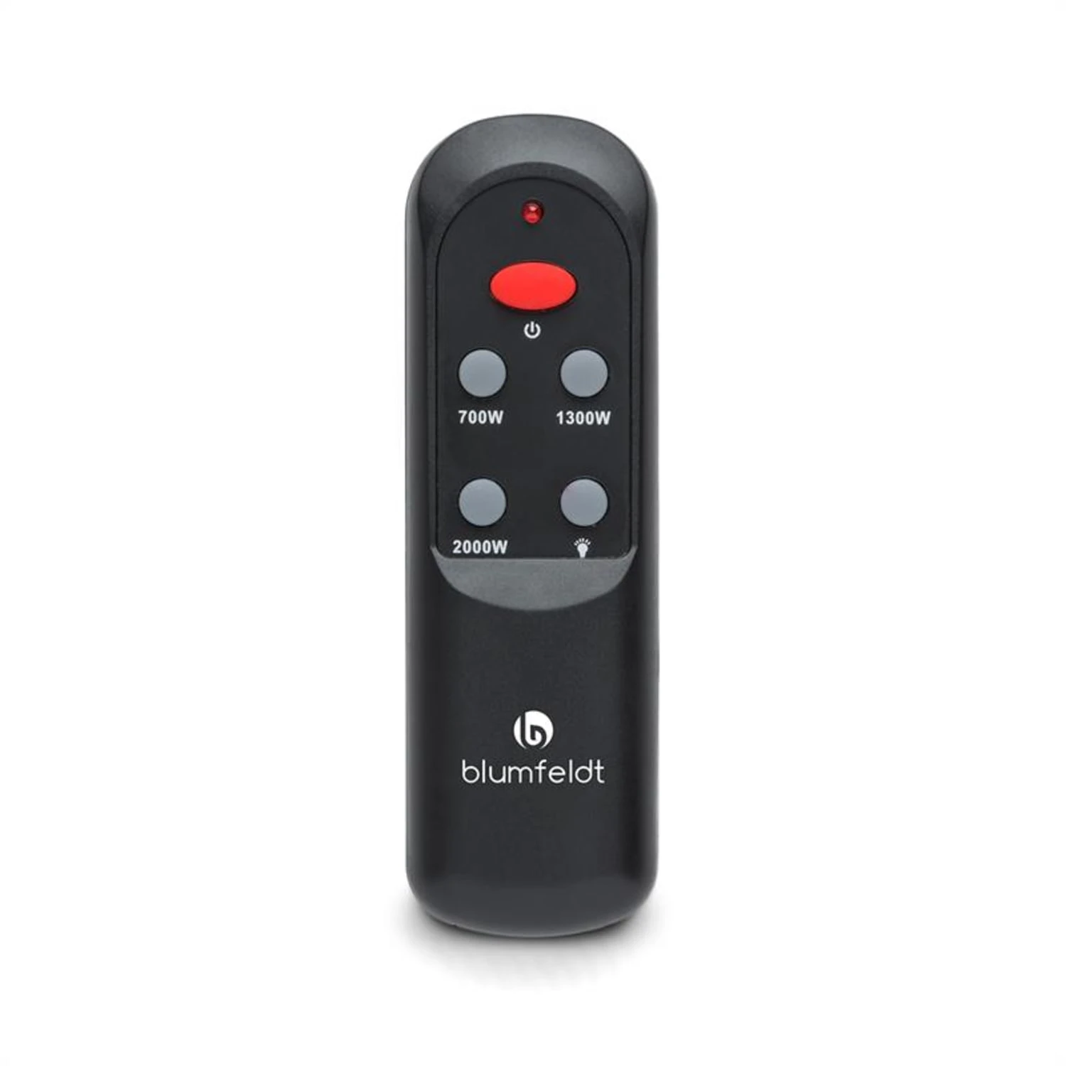 Die Fernbedienung hat einen ovalen Ein- und Ausschalter zentral am oberen Rand. Durch die längliche Form und das Rot ist er leicht zu erkennen, eine versehentliche Betätigung ist somit ausgeschlossen. Mithilfe der großzügig angeordneten Knöpfe und der leicht zu lesenden Beschriftung lassen sich die unterschiedlichen Wattzahlen ohne Verzögerung bequem auswählen. Die einstellbaren Stufen betragen 700, 1300 und 2000 Watt.