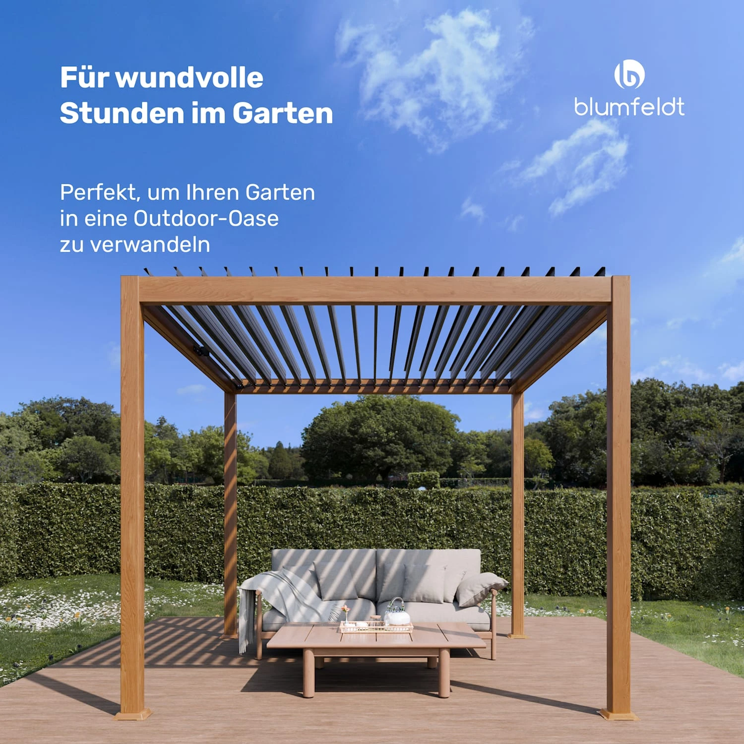 Die Blumfeldt LuminaHaven Pergola ist dein ganzjähriger Rückzugsort für sonnige Tage und entspannte Abende.