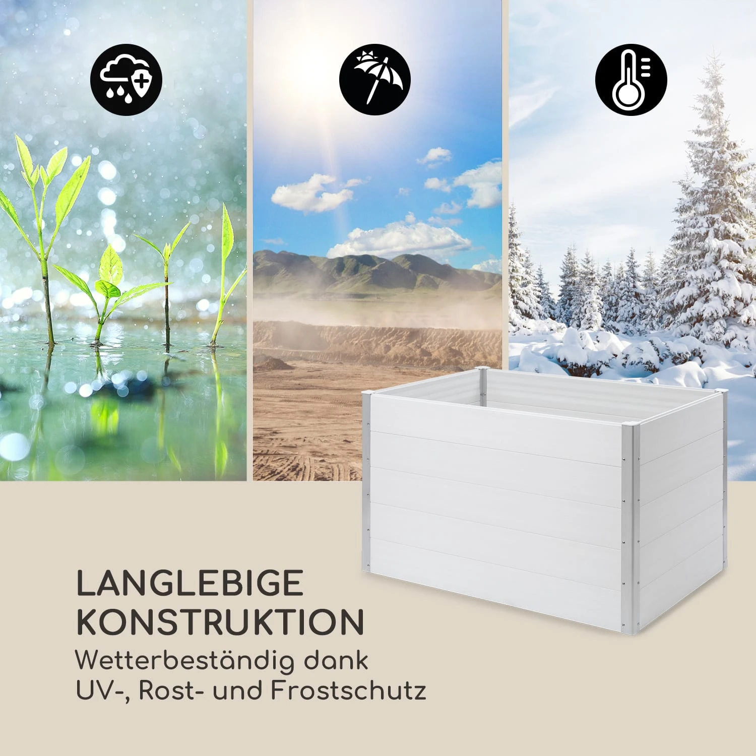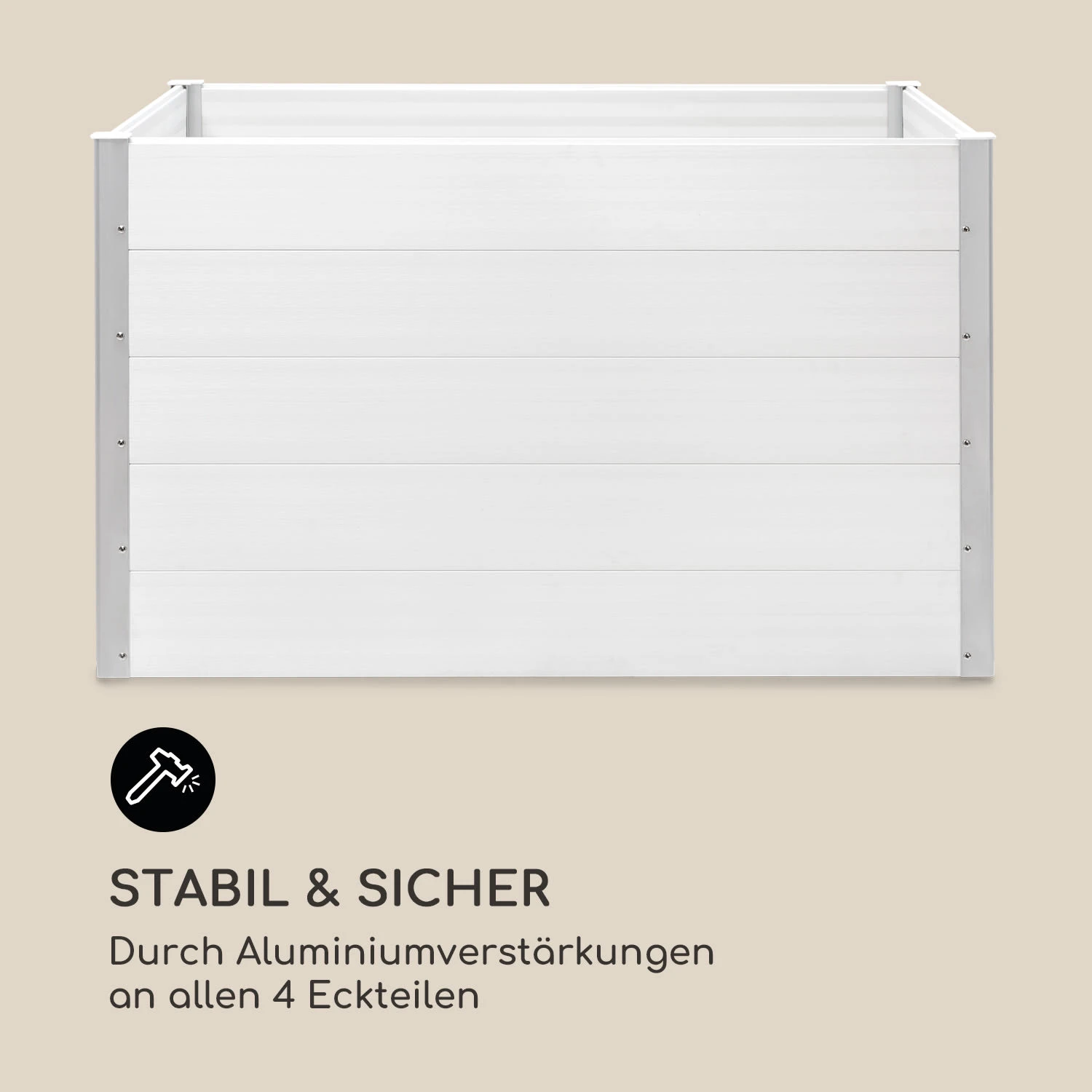 Das stabile Gartenbeet ist aus wetterbeständigem WPC (Wood Plastic Composite) gefertigt und dank UV-, Rost- und Frostschutz bestens für den dauerhaften Einsatz im Außenbereich geeignet. Mit ihrer natürlichen Holzoptik fügt sich die Konstruktion ideal in jedes Garten- und Terrassenambiente ein und wertet ihre Umgebung dank einer Farbgebung in schlichtem Weiß eindrucksvoll auf. Mit 91 cm verfügt das Nova Grow über eine besonders angenehme Höhe, die sowohl beim Bepflanzen als auch beim Ernten ein rückenschonendes Arbeiten ohne mühsames Bücken ermöglicht. Das Hochbeet aus Kunststoff kann in nur kurzer Zeit aufgebaut werden und verspricht dank Aluminiumverstärkungen an allen 4 Eckteilen eine besonders hohe Robustheit und Stabilität.