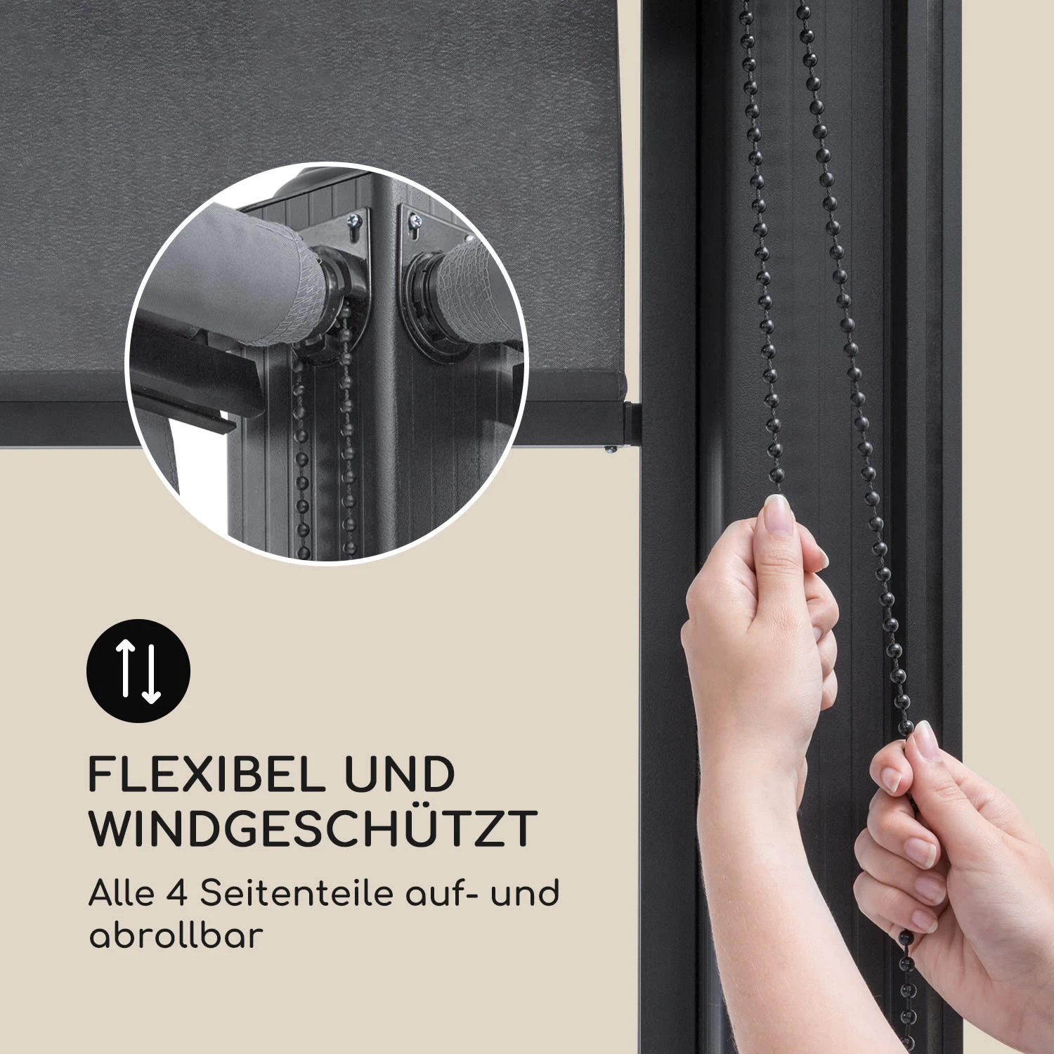 auf- und abrollbaren Seitenteile aus 160 g/m² Polyester-Stoff bleibt man die