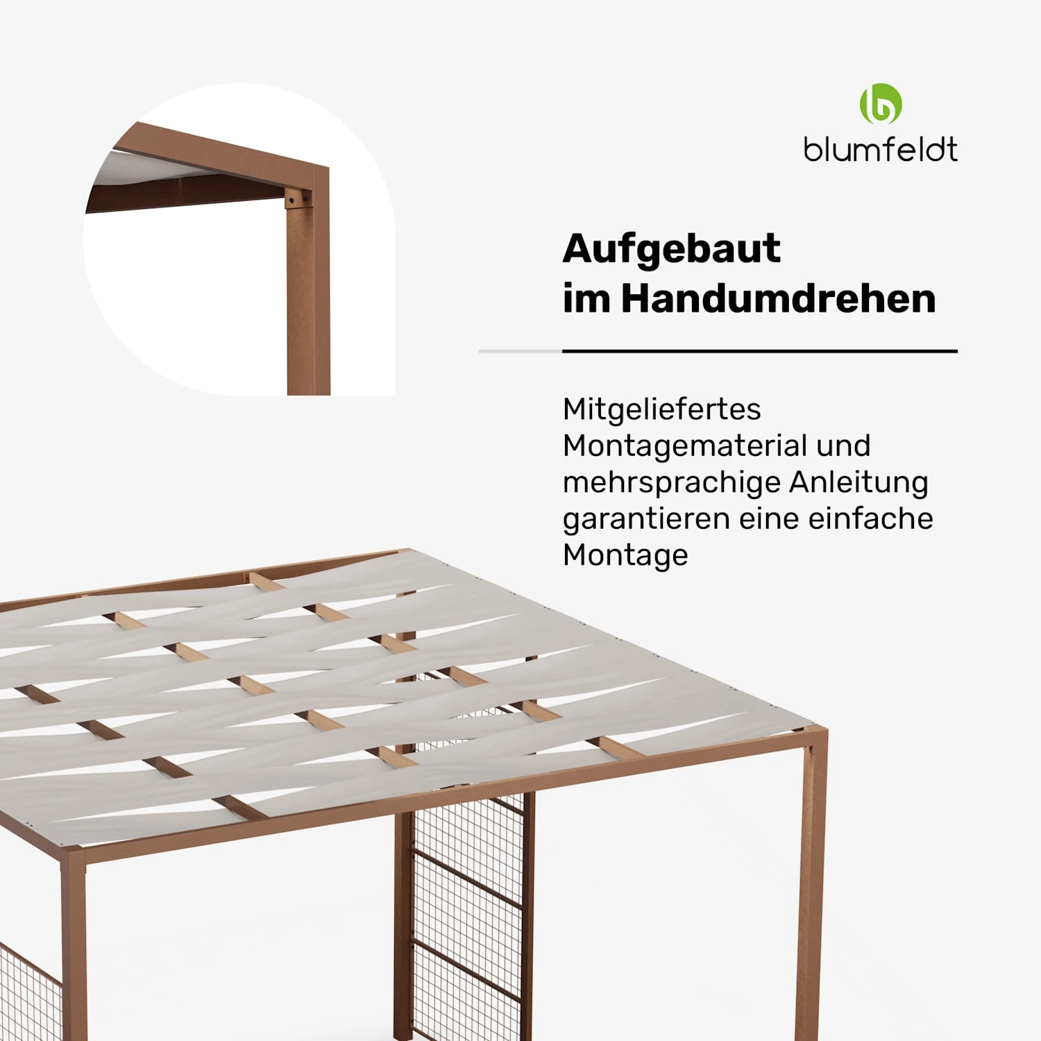 Die Montage ist dank des mitgelieferten Montagewerkzeugs und der Bodennägel denkbar einfach. Mit ihren großzügigen Maßen bietet die Pergola Ihnen und Ihren Lieben ausreichend Platz, um gemeinsam die Natur zu genießen und entspannte Stunden im Freien zu verbringen.