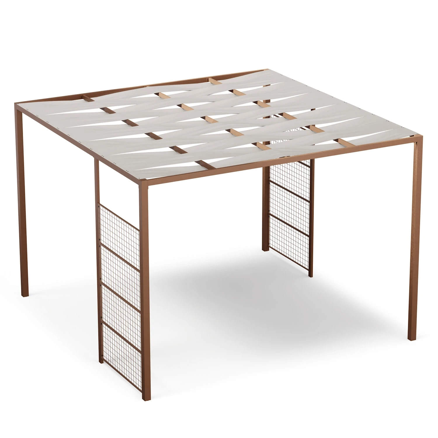 Integrierte Rankgitterwand: Die Pergola ist mit einer integrierten Wandbegitterung aus Stahlseilen ausgestattet, die für zusätzliche Privatsphäre sorgt und der Struktur einen modernen berankbaren Look verleiht