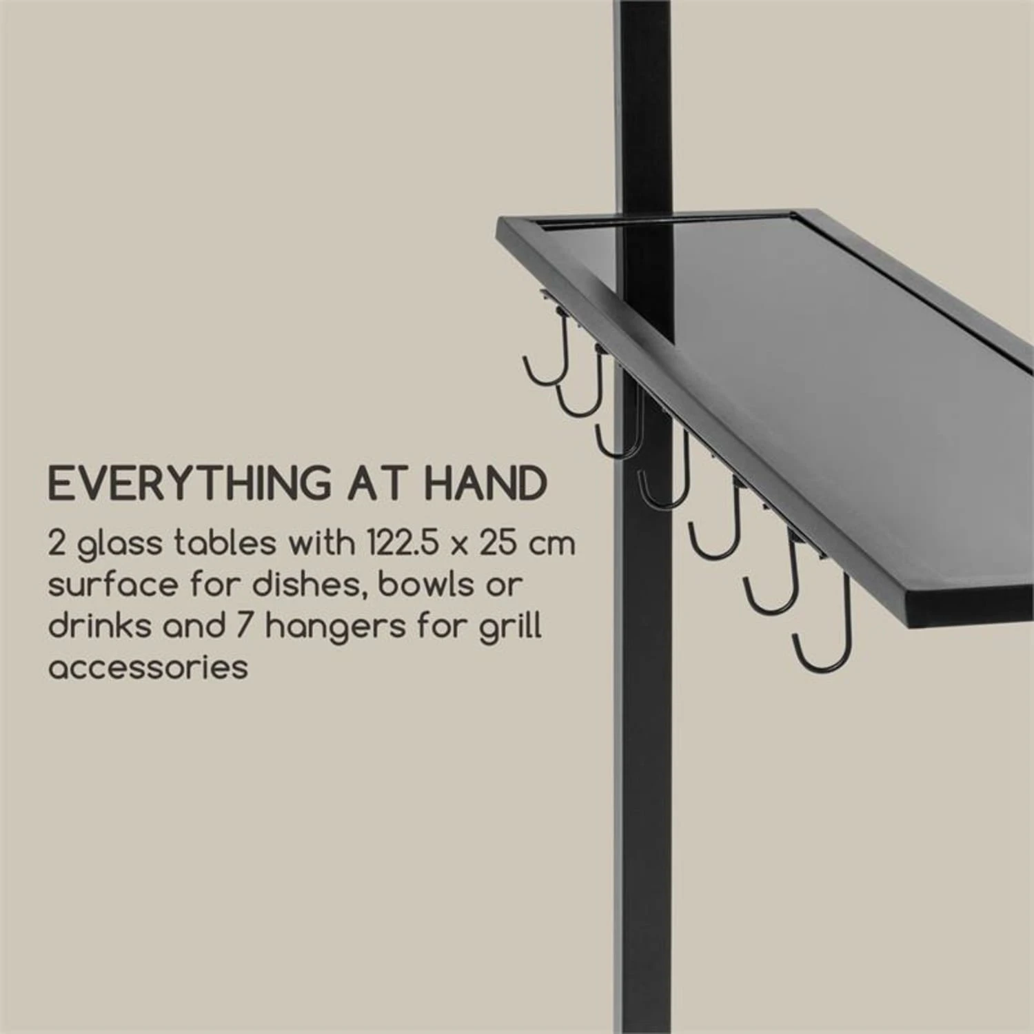Alles zur Hand: 2 Glastische mit 122,5 x 25 cm Fläche für Geschirr, Schüsseln oder Getränke und 7 Aufhänger für Grillzubehör