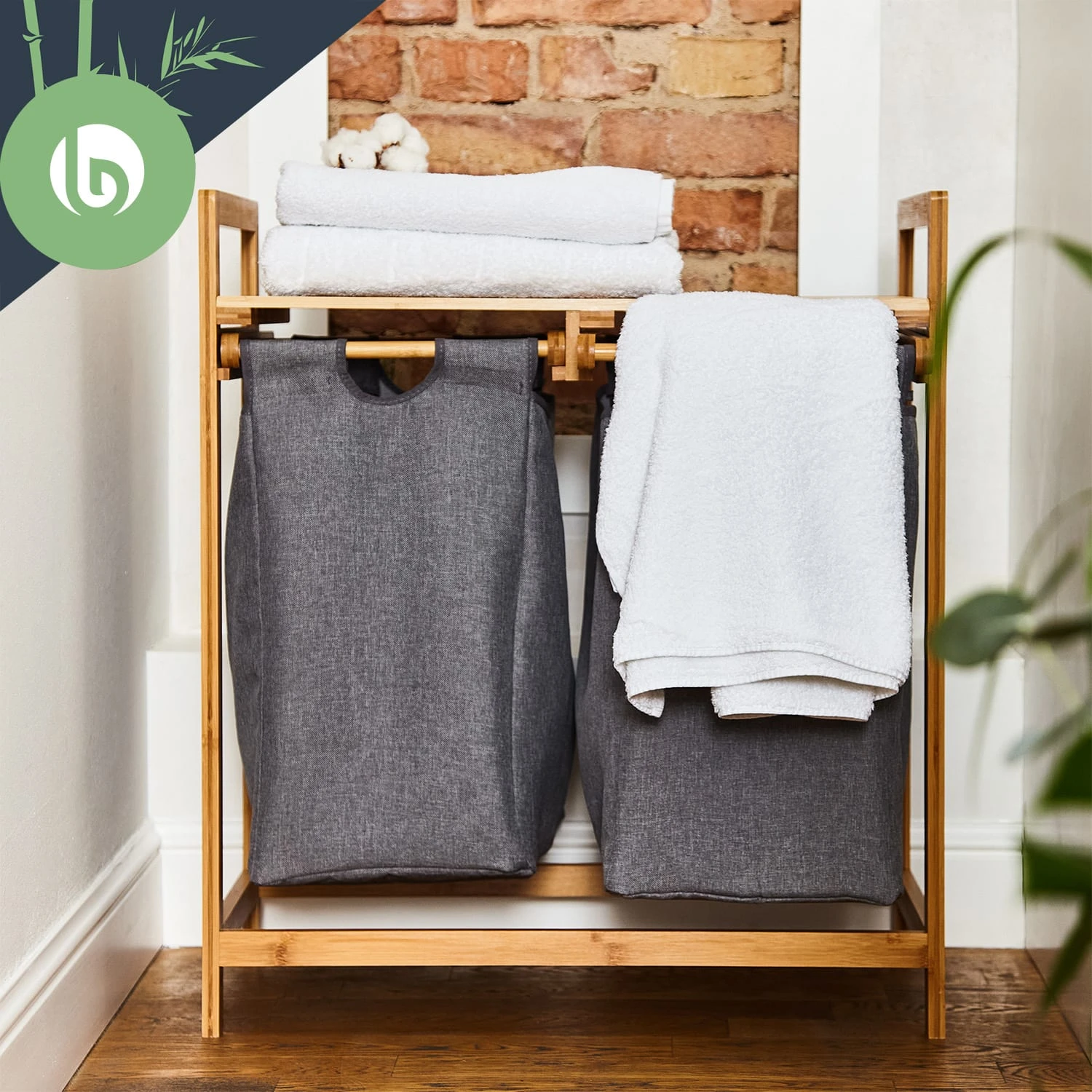 Natürliche Materialien: Wäschestation aus Bambus mit Waschsäcken aus Baumwollleinen