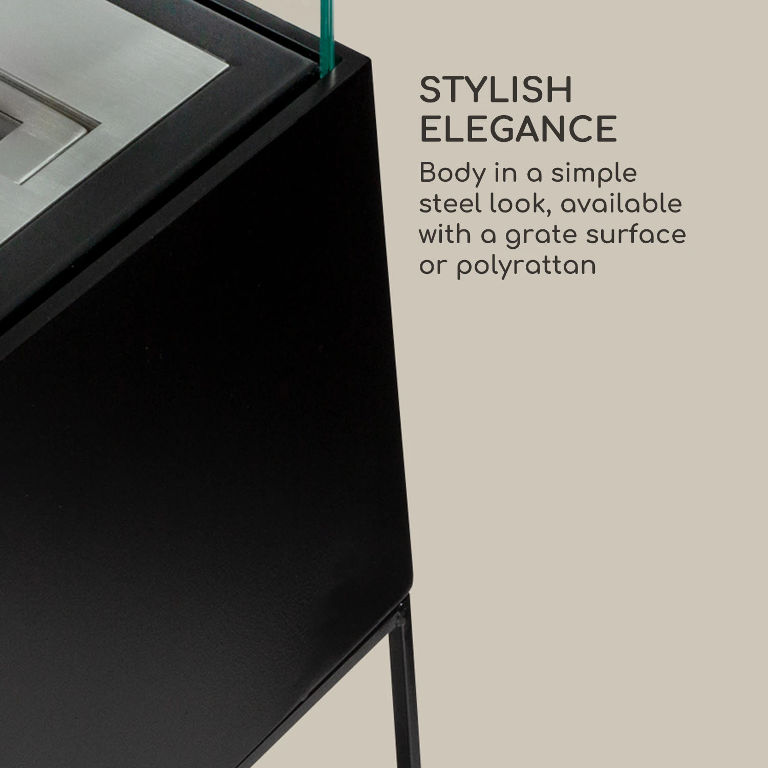 Stilvolle Eleganz: Korpus in schlichter Stahloptik, mit Rostoberfläche oder Polyrattan erhältlich
